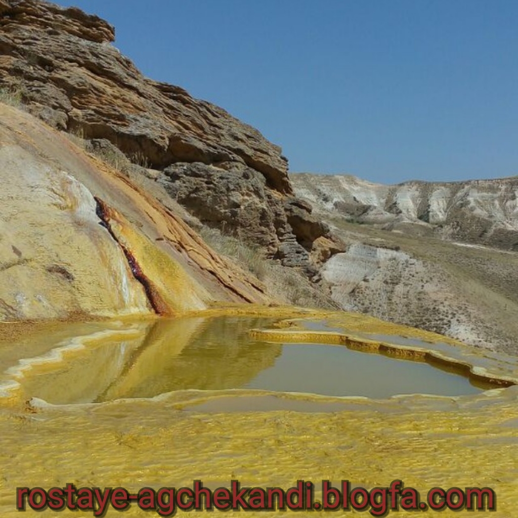 آب این چشمه که با فشار متوسط گاز از دل زمین به بیرون می جوشد با خودش آهک را نیز از اعماق به سطح زمین می آورد و به مرور زمان در محل جوشش آب لایه ای از املاح به صورت ورقه ورقه به وجود می آید و زمانی که ضخامت این لایه ها زیاد شد سطح وسیعی از سنگ تراورتن در اطراف این چشمه ایجاد می شود.