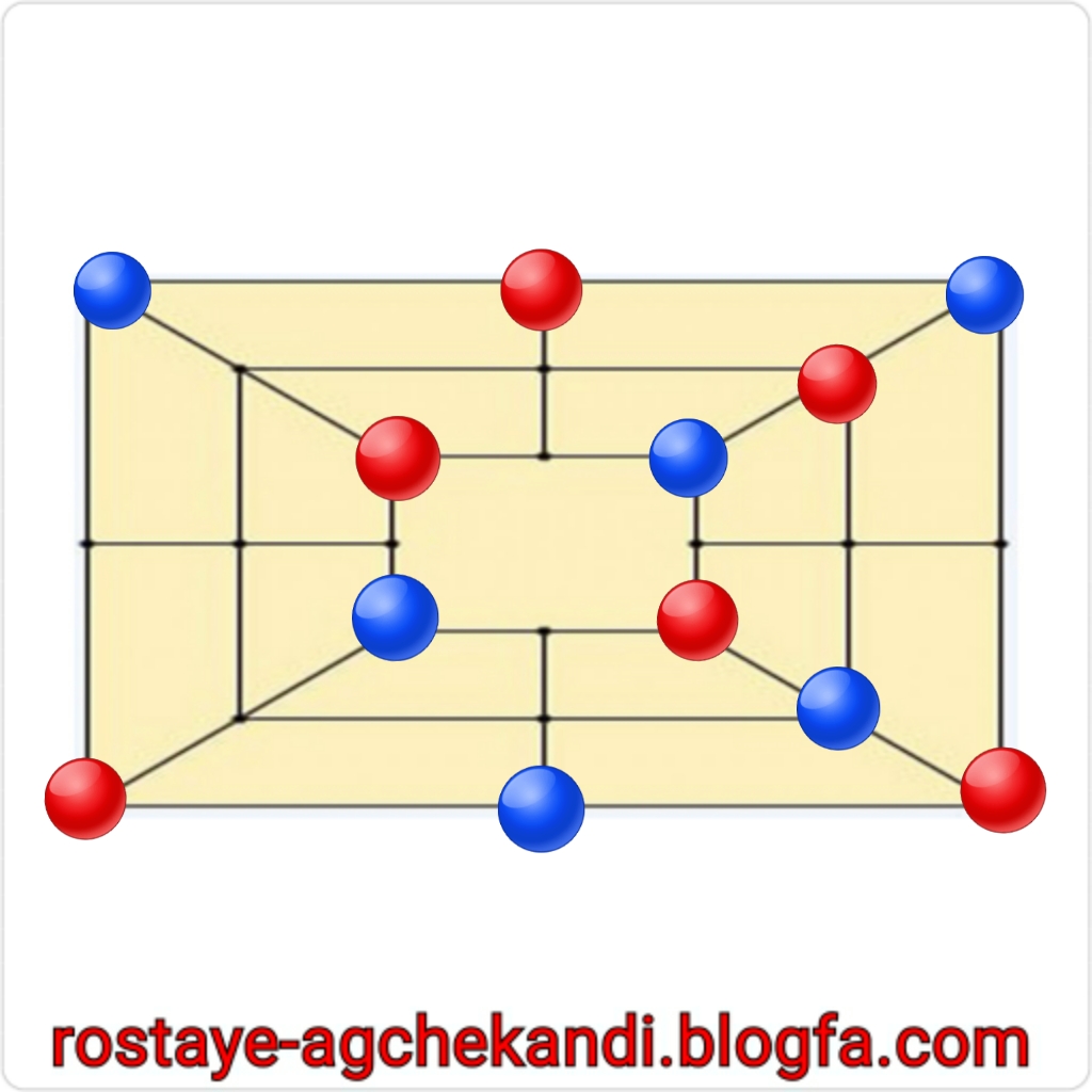 در روش ۱۲ تایی باید ۳ مربع در داخل یکدیگر ترسیم شود و گوشه های مربع بزرگتر به یکدیگر متصل شود. اگر این کار را انجام دهید مشاهده می کنید که گوشه های مربع کوچک نیز مانند شکل زیر ، خود به خود به یکدیگر متصل می شوند، پس از آن برای اینکه یک جایگاه ۲۴تایی داشته باشیم، باید وسط اضلاع مربع کوچک درونی را به وسط اضلاع مربع بزرگ بیرون متصل کنیم، به این ترتیب یک جایگاه ۲۴ تایی در اختیار داریم مانند چیزی که در تصویر زیر مشاهده می کنید. پس از ترسیم طرح دوز، باید یک نفر به انتخاب بازی را شروع کند. او اولین مهره را قرار می دهد و به ترتیب و یک در میان مهره ها در جایگاه خود قرار می گیرند، هر کسی که موفق شود ۳ مهره را در یک خط و راستا قرار دهد، می تواند یکی از مهره های حریف را از میدان بازی حذف کند. البته باید به این نکته توجه شود که در بازی سه تایی با روی خط قرار گرفتن ۳ مهره بازی تمام می شود. علت آن این است که مهره های حریف به عدد ۲ رسیده و دیگر نمی تواند بازی را ادامه دهد، اما در بازی های ۱۲ تایی تا جایی که عدد مهره های حریف به دو برسد بازی ادامه دارد.